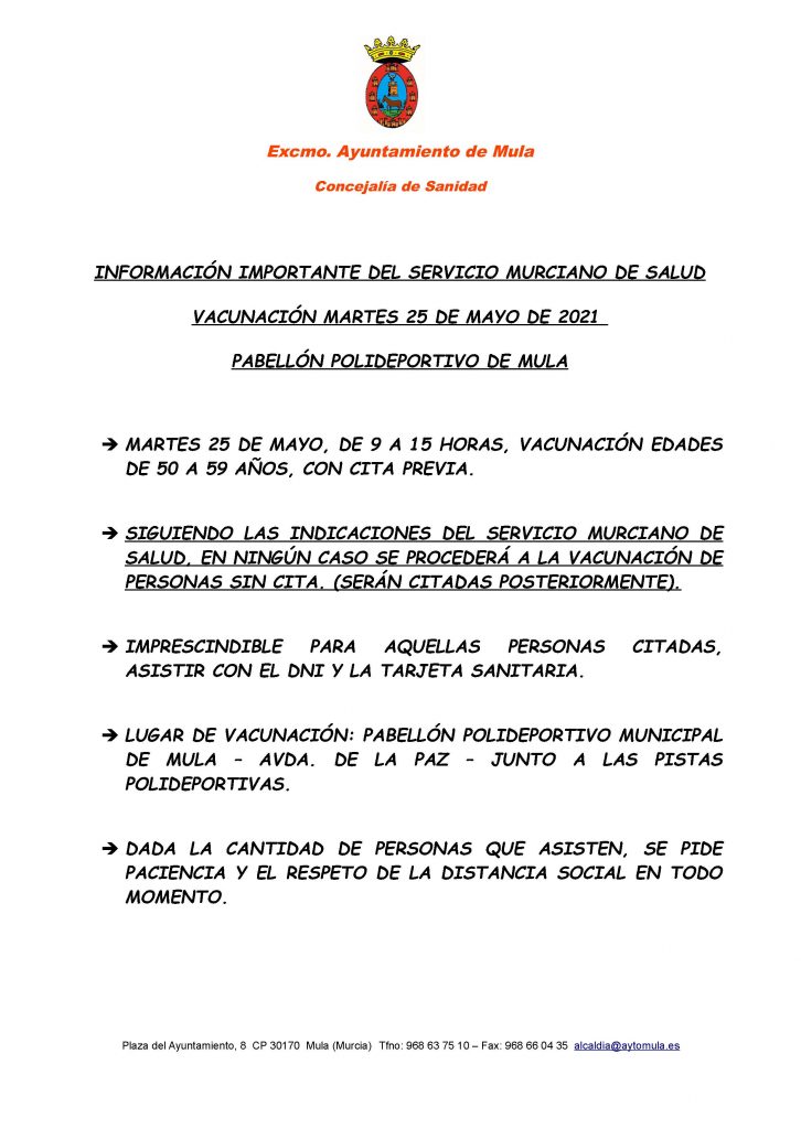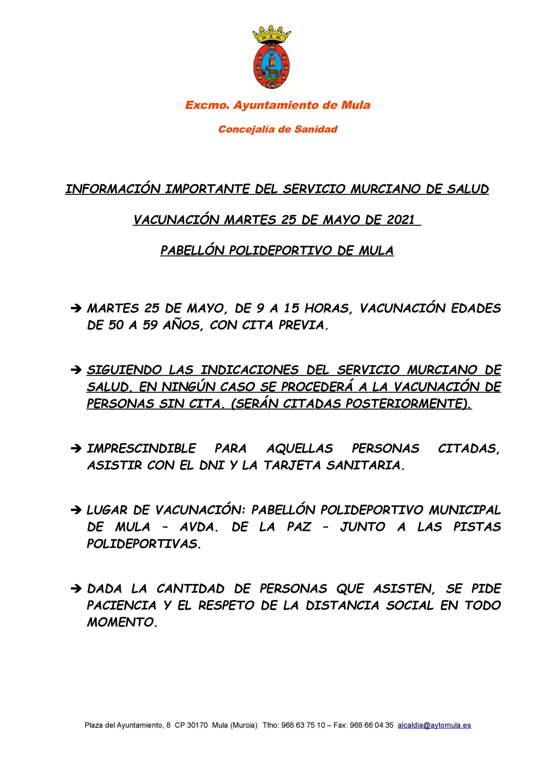 Indicaciones del Servicio Murciano de Salud para la vacunación masiva de personas con cita, que se llevará a cabo mañana martes, 25 de mayo en el Pabellón Municipal de Mula. (50-59 años con cita previa).