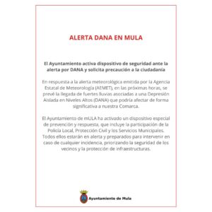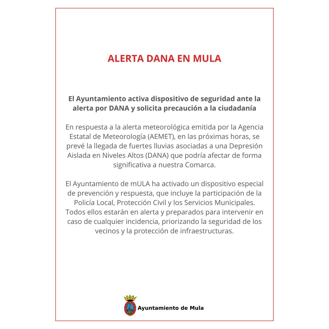 Mula, 28 de octubre de 2024 – En respuesta a la alerta meteorológica emitida por la Agencia Estatal de Meteorología (AEMET), el concejal de Seguridad Ciudadana y Emergencias, Diego Boluda, ha anunciado que, en las próximas horas, se prevé la llegada de fuertes lluvias asociadas a una Depresión Aislada en Niveles Altos (DANA) que podría afectar de forma significativa a nuestra Comarca.