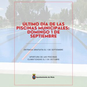 Mula, 29 de agosto de 2024 – El Ayuntamiento de Mula informa a todos los vecinos y vecinas que el último día de funcionamiento de las piscinas municipales de verano será este domingo, 1 de septiembre. Para despedir la temporada estival, la entrada será gratuita para todos los usuarios, permitiendo así a las familias disfrutar de un día de ocio en nuestras instalaciones.