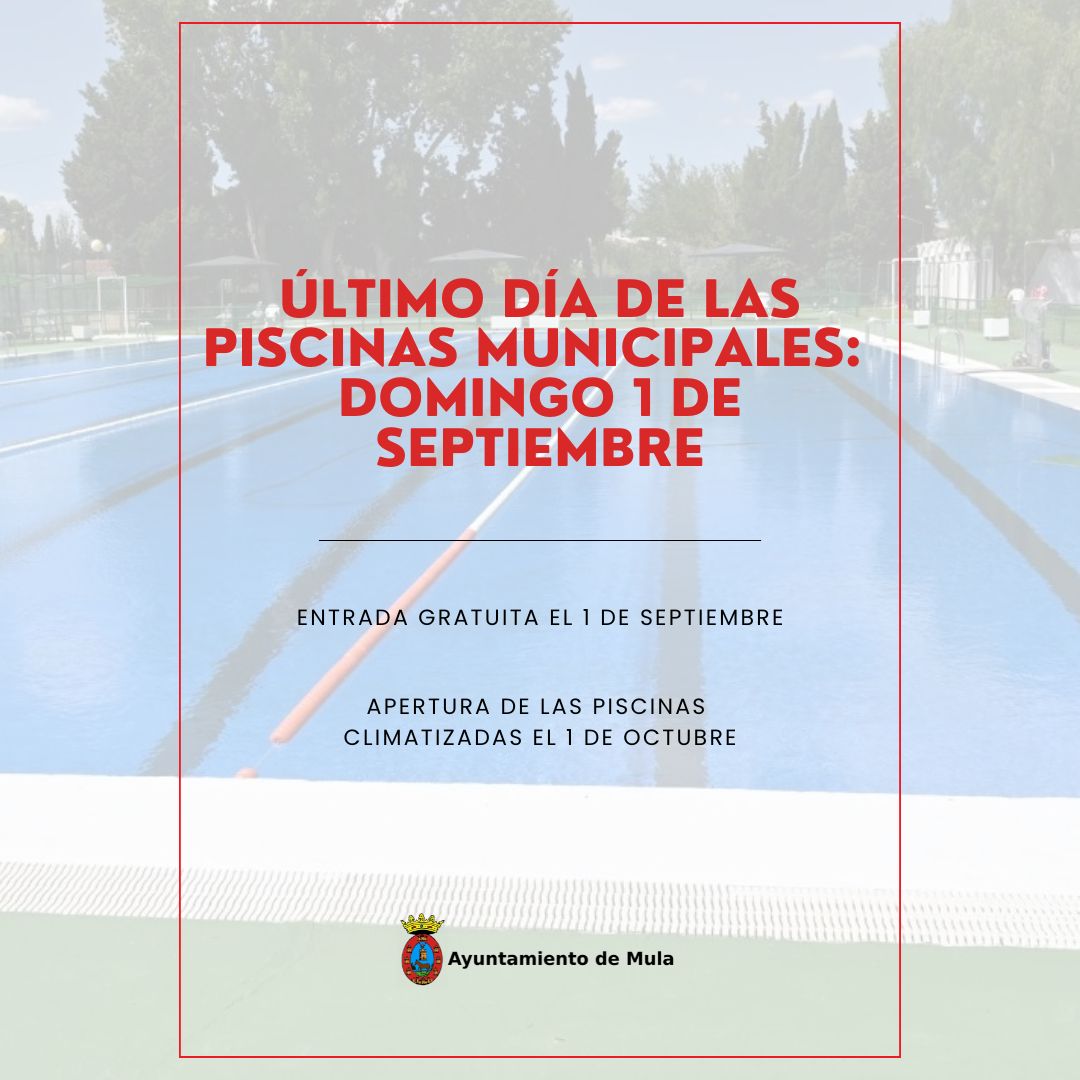 El Ayuntamiento de Mula anima a todos a aprovechar este último día de piscinas de verano y a prepararse de cara a la nueva temporada en las piscinas climatizadas.