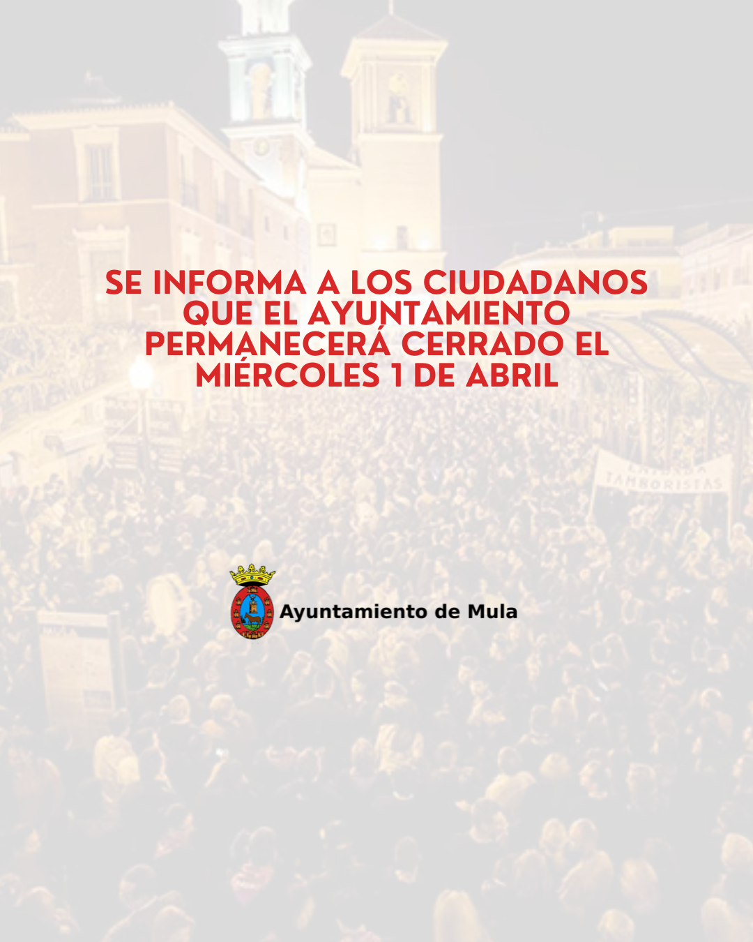 View Larger Image SERVICIOS | Ayuntamiento cerrado el miércoles 1 de abril de 2026 Se informa a los ciudadanos que el miércoles 1 de abril, el Ayuntamiento permanecerá cerrado. Comparte esto: Comparte en Facebook (Se abre en una ventana nueva) Facebook Compartir en X (Se abre en una ventana nueva) X Compartir en Telegram (Se abre en una ventana nueva) Telegram Compartir en WhatsApp (Se abre en una ventana nueva) WhatsApp Imprimir (Se abre en una ventana nueva) Imprimir admin2026-03-30T20:19:13+02:00lunes, 30 marzo 2026|servicios|