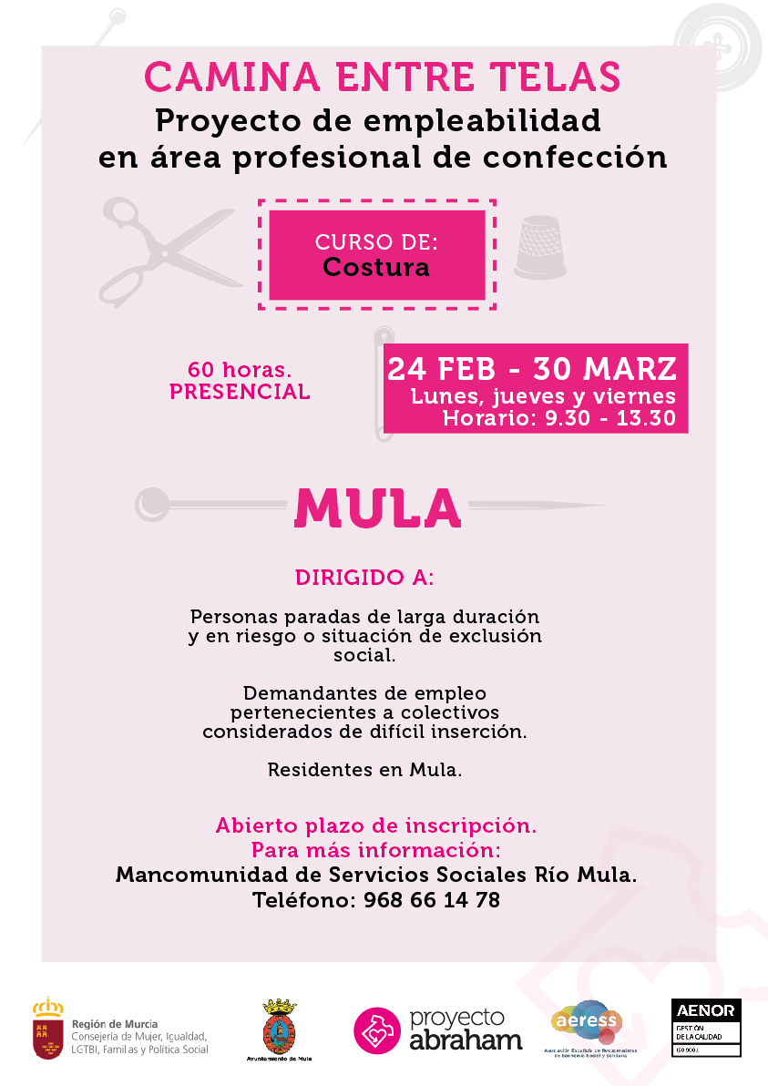 El Ayuntamiento de Mula, en colaboración con Proyecto Abraham, pone en marcha Camina entre telas, un proyecto de empleabilidad en el área profesional de confección, donde se va a impartir un curso de costura en el municipio.