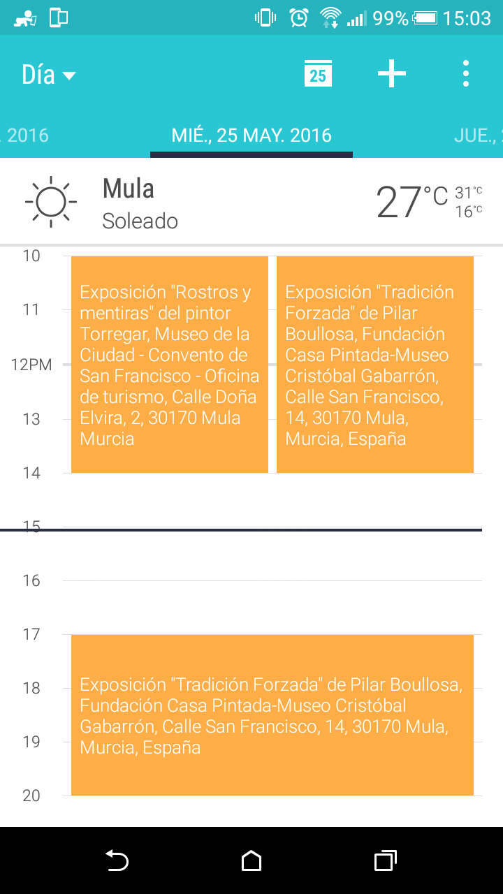 La vista final del calendario puede ser similar a la siguiente imagen. Puede variar dependiendo de la versión de Android, y de la marca y modelo del dispositivo.