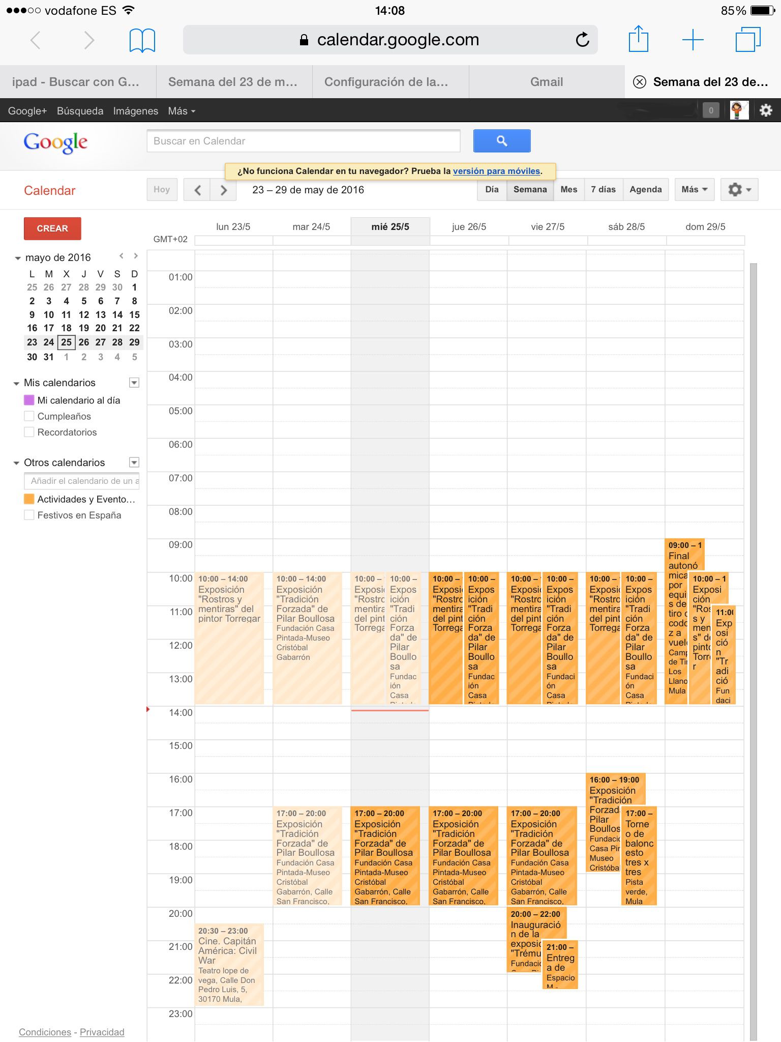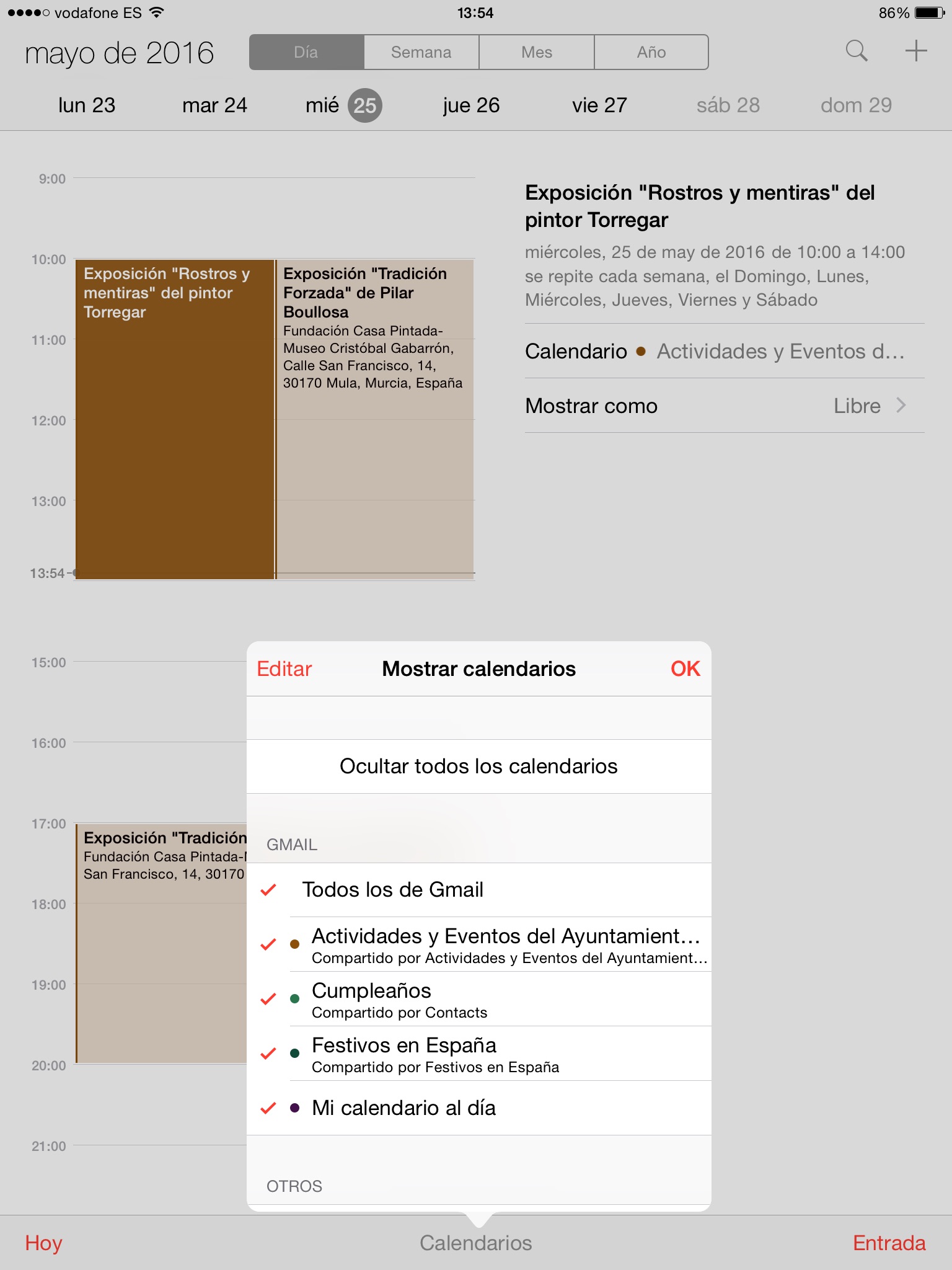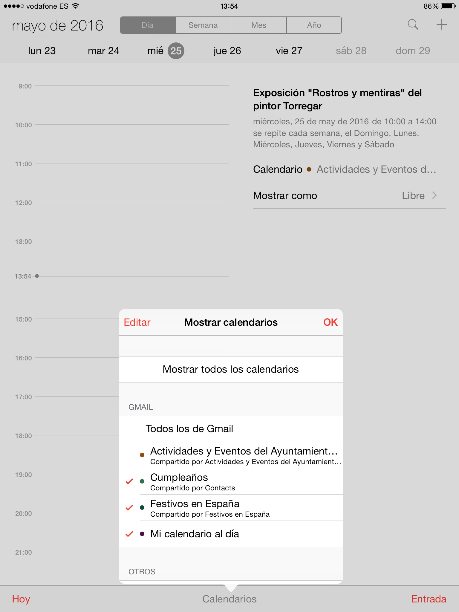 Para ello, pinchamos en Calendarios y en la lista desplegable, elegimos los calendarios a mostrar.