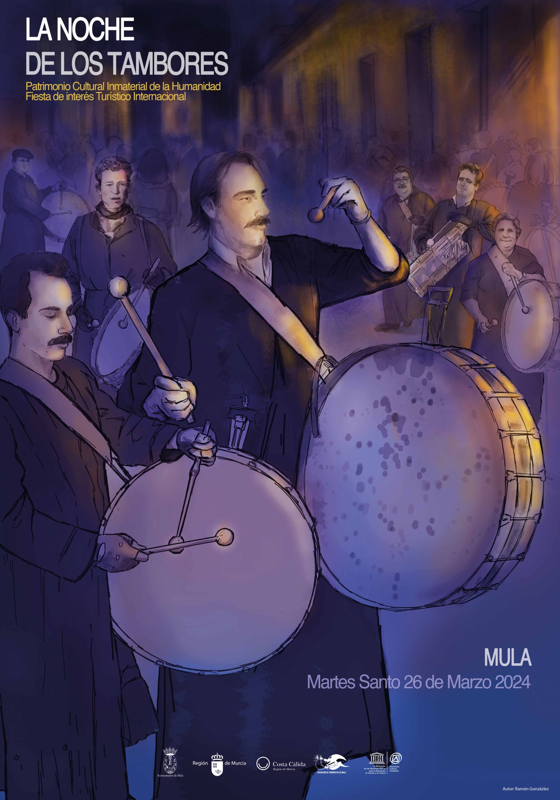 El cartel, realizado por el artista muleño Ramón González Palazón, representa «la historia de nuestra Noche de los Tambores, a través de tamboristas icónicos de Mula. Una imagen que nos deja echar la vista atrás y recordar a quienes nos precedieron en la celebración de nuestra más emblemática fiesta», ha explicado el alcalde de Mula a la vez que ha dado la enhorabuena al autor. Asimismo, el edil muleño ha destacado que el cartel de La Noche de los Tambores, declarada fiesta de Interés Turístico Internacional y Patrimonio Cultural Inmaterial de la Humanidad por la UNESCO, se presentará esta semana en Feria Internacional de Turismo 2024 (FITUR).
