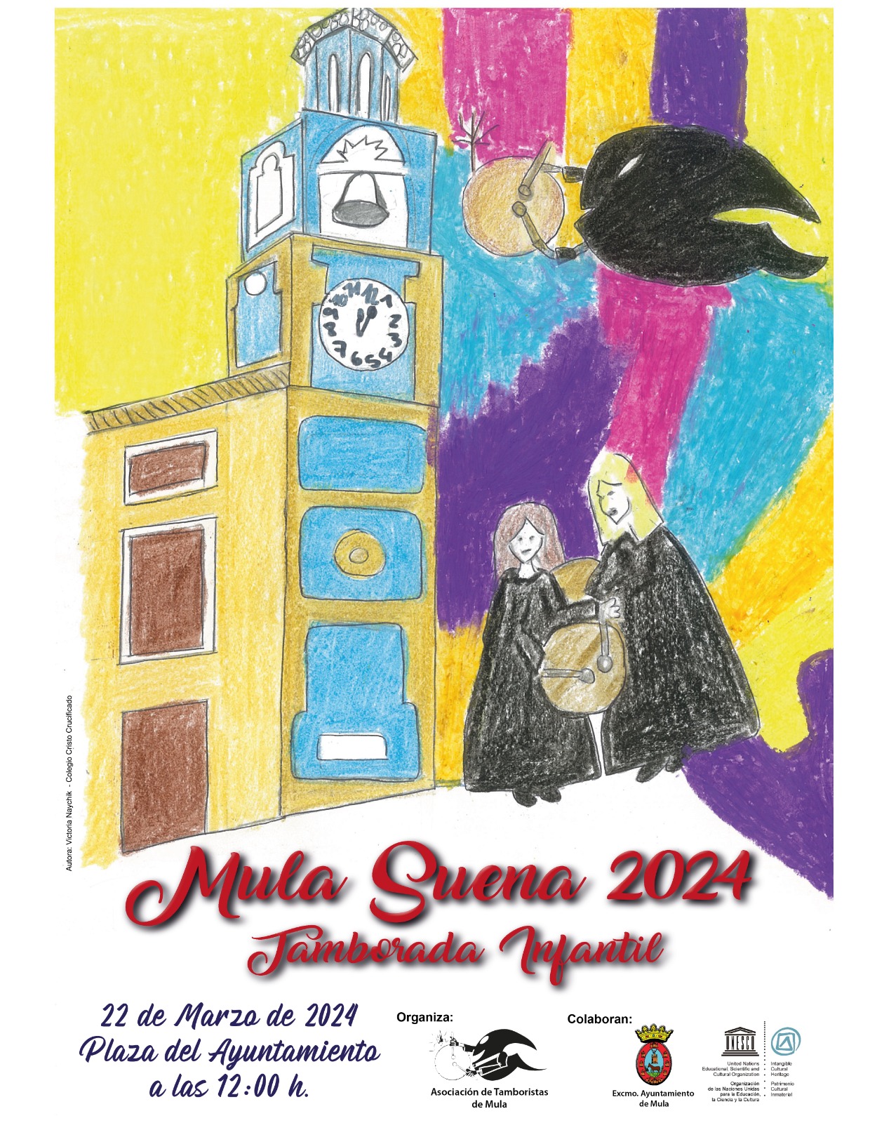 Por otro lado, durante la gala se entregaron los premios del concurso de dibujo infantil ‘Cartel Tamborada Infantil’, convocado por la Concejalía de Tambores del Ayuntamiento de Mula, al que se presentaron un total de 63 trabajos del alumnado de 6º de Primaria de todos los colegios de Mula y pedanías. El dibujo ganador fue el de Victoria Naychik, del colegio Cristo Crucificado, galardonada con un vale de 100 euros para canjear por material escolar en Librería Marisa. Además, el dibujo ilustra el cartel de la Tamborada Infantil 2024, que se celebrará el viernes, 22 de marzo, a las 12 horas, en la plaza del Ayuntamiento. Irene Sánchez Asensio y María Fernández Gutiérrez, ambas del CEIP Anita Arnao, se hicieron con los Accésits del certamen, ganando cada una un vale de 50 euros para canjear por material escolar en la Librería Marisa.