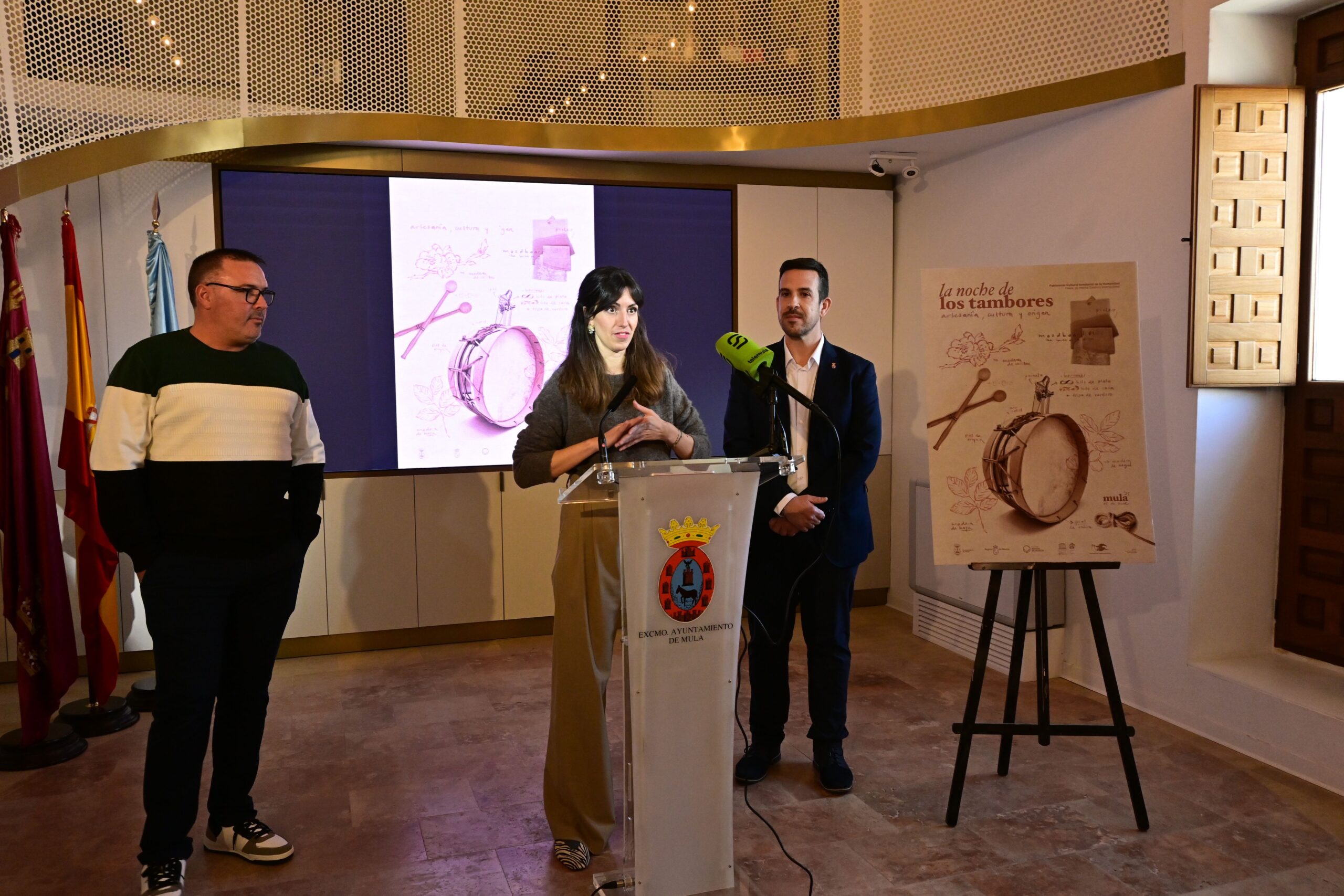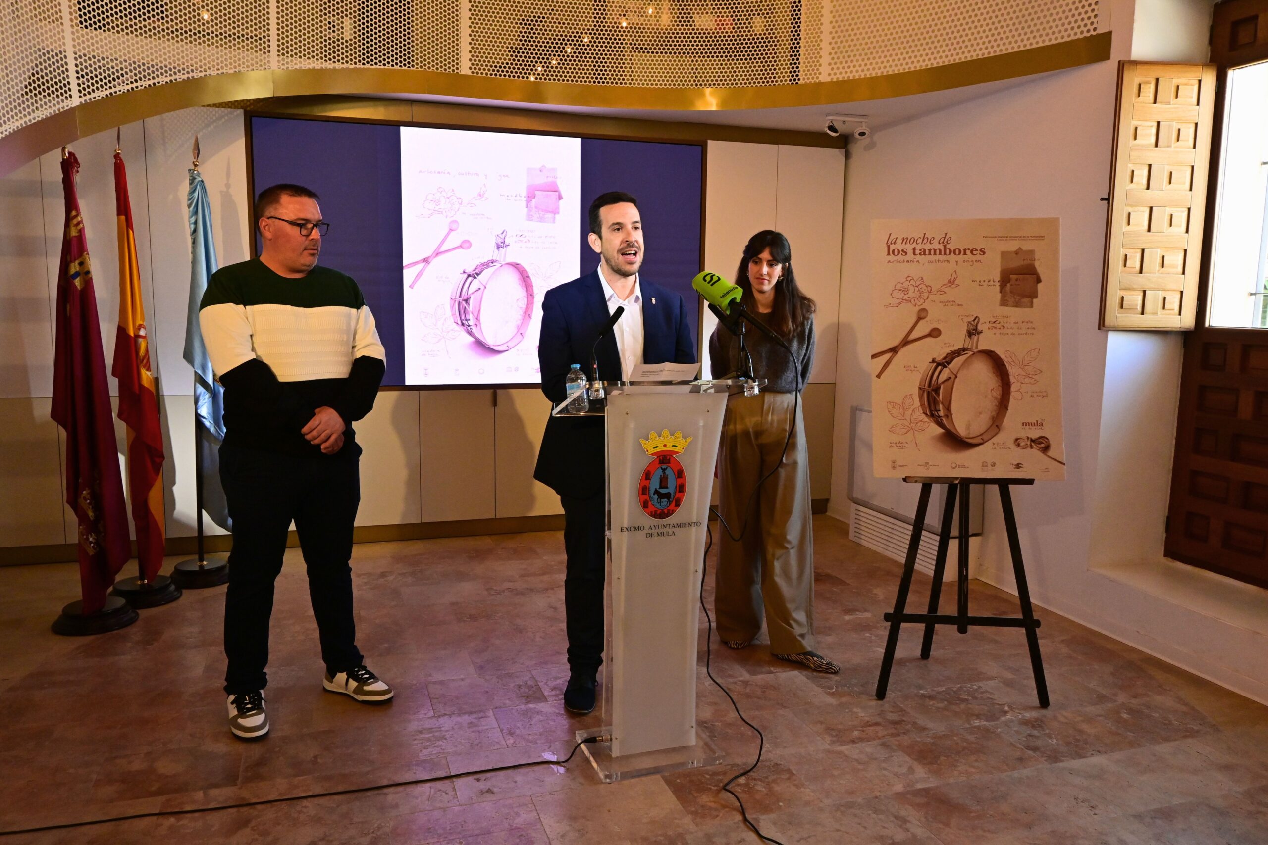 El Ayuntamiento de Mula, junto con la Asociación de Tamboristas, ha presentado hoy el cartel oficial de la Noche de los Tambores 2025, obra de la muleña Clara García Soriano. El acto, celebrado en el Convento San Francisco, contó con la presencia del concejal de Tambores, Diego Boluda, y el presidente de la Asociación de Tamboristas, Manuel Nadal, acompañados por el diputado regional Fernando Moreno y miembros de la corporación municipal, quienes destacaron la singularidad y el simbolismo de esta obra como preludio a una de las celebraciones más emblemáticas de la Semana Santa muleña.