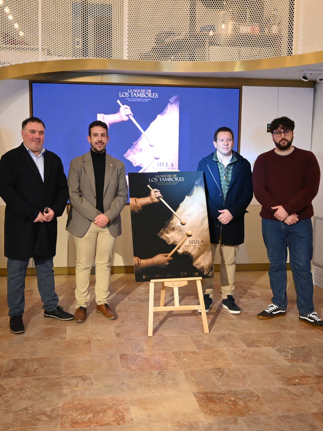 Esta tarde se ha presentado oficialmente el cartel anunciador de la Noche de los Tambores de Mula 2026, una obra del artista muleño Pablo Espinosa, en un acto que ha contado con la participación del alcalde de Mula, Juan Jesús Moreno; el concejal de Tambores, Diego Boluda; y el presidente de la Asociación de Tamboristas de Mula, Manuel Nadal, acompañados por el diputado regional, Fernando Moreno; miembros del equipo de gobierno, de la corporación municipal y numerosos vecinos y vecinas.