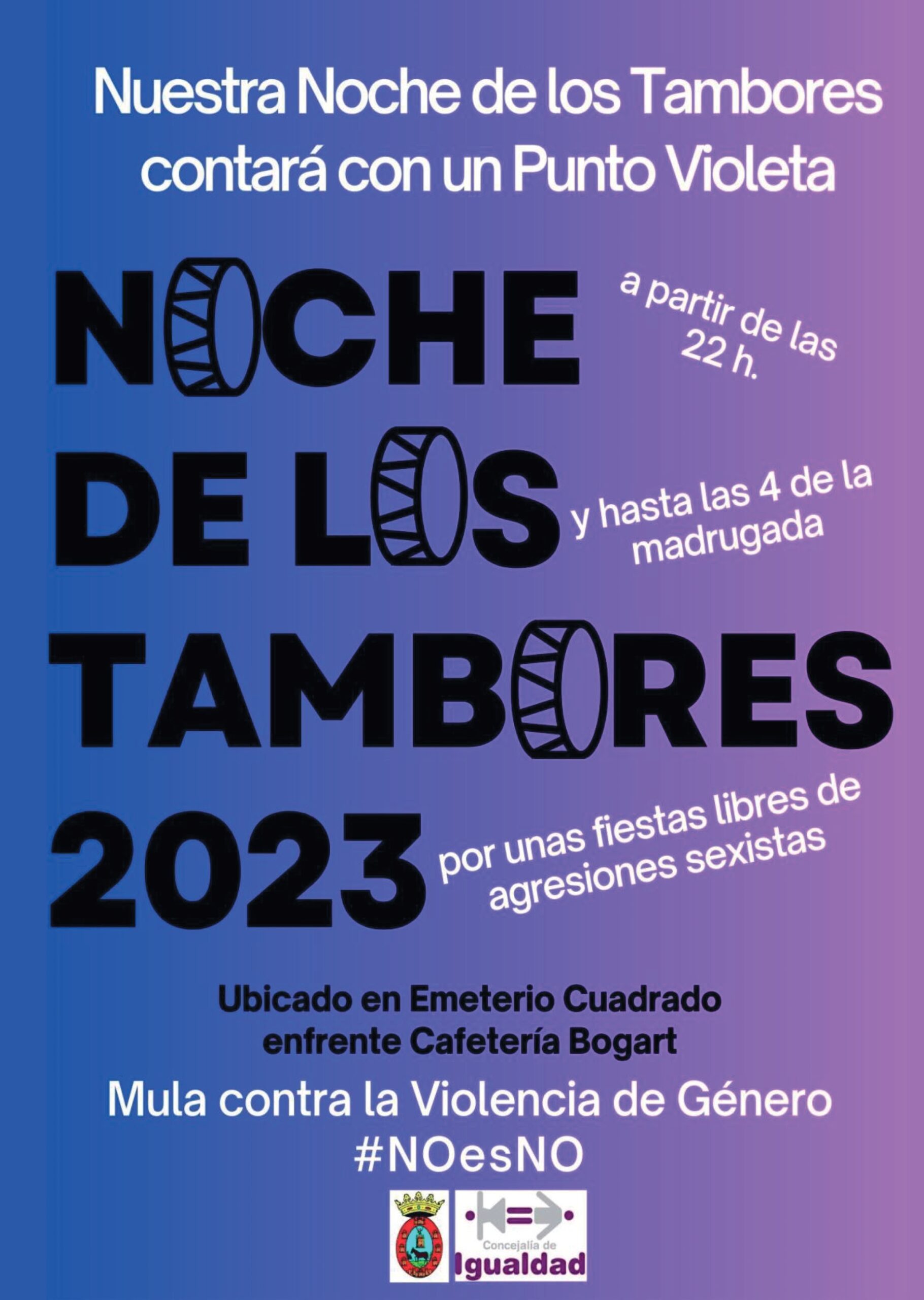 El Ayuntamiento de Mula va a instalar durante La Noche de los Tambores un Punto Violeta, para unas fiestas libres de agresiones sexistas. Ubicado en la calle Emeterio Cuadrado (frente a la Cafetería Bogart), estará desde las 22 horas del martes, 4 de abril, hasta las 4 de la madrugada del miércoles, 5 de abril.