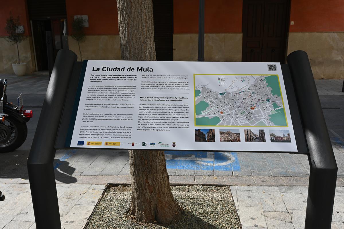 Se están instalando señales verticales, que indican dirección y distancia, con las que cualquier persona podrán guiarse por el centro de Mula y seguir una ruta recorriendo sus lugares más emblemáticos, como la plaza del Ayuntamiento, la Casa Pintada, el Museo de Arte Ibérico El Cigarralejo, el Convento de San Francisco, el Real Monasterio de la Encarnación, el Castillo de Mula, entre otros. Asimismo, gracias a señales de interpretación del patrimonio, situadas a baja altura para ser totalmente accesibles, los visitantes reconocerán el monumento que están visitando a través de una breve descripción del mismo y un código QR.