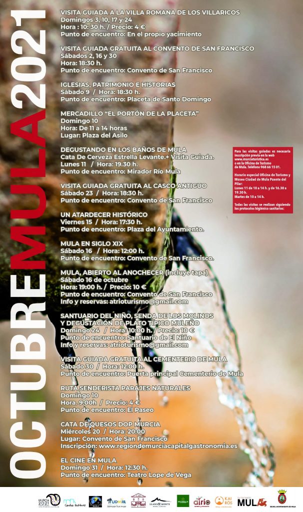 La concejalía Turismo del Ayuntamiento de Mula organiza, para el mes de octubre, diversas propuestas y actividades para seguir mostrando el municipio y sus recursos tanto a muleños como visitantes. Un extenso programa en el que las visitas guiadas, degustaciones y artesanía forman parte de las principales propuestas.