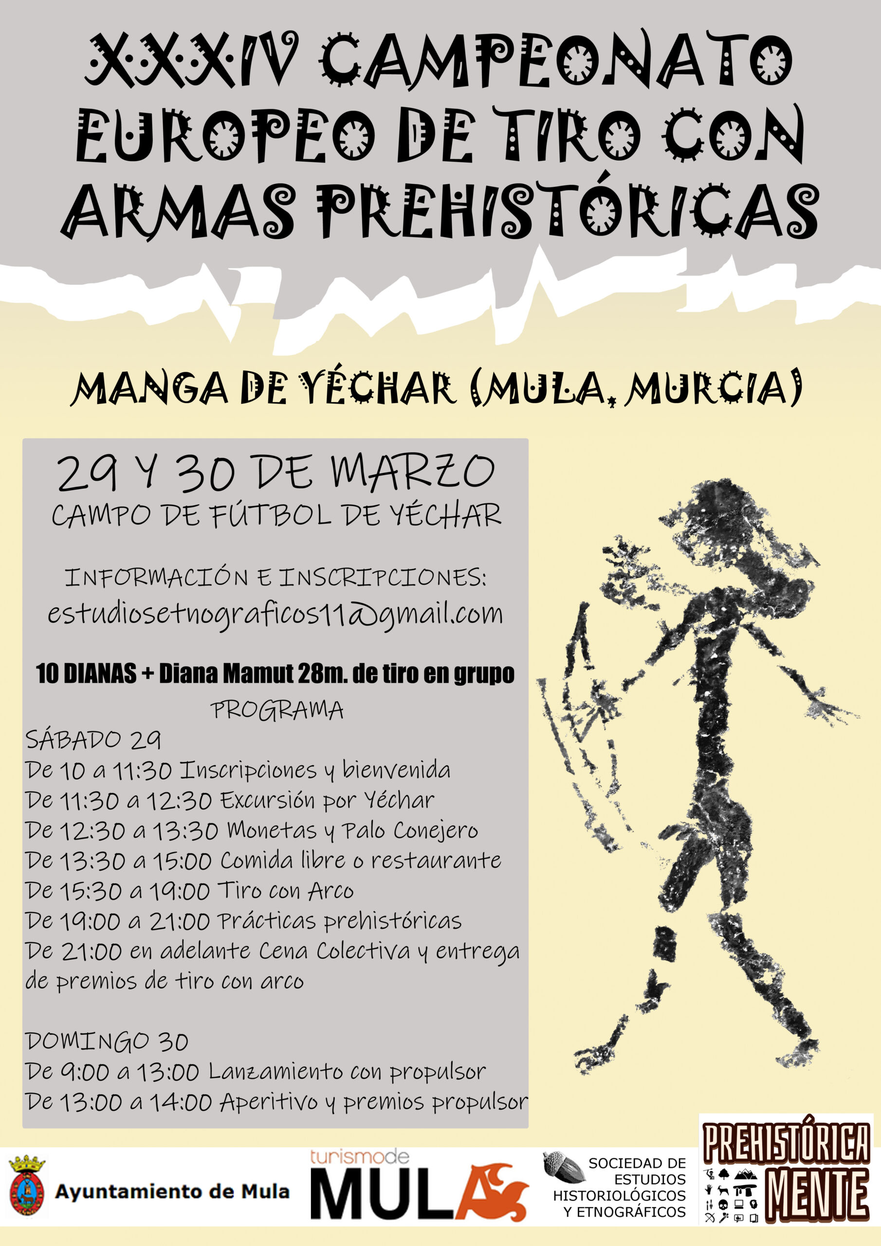 La Sociedad de Estudios Historiológicos y Etnográficos, junto al Ayuntamiento de Mula, organiza una nueva manga del XXXIV Campeonato Europeo de Tiro con Arco y Propulsor Prehistóricos, que tendrá lugar en la localidad de Yéchar los días 29 y 30 de marzo. Este evento, que combina deporte, historia y tradición, reunirá a participantes de toda Europa en un entorno privilegiado con gran valor patrimonial.